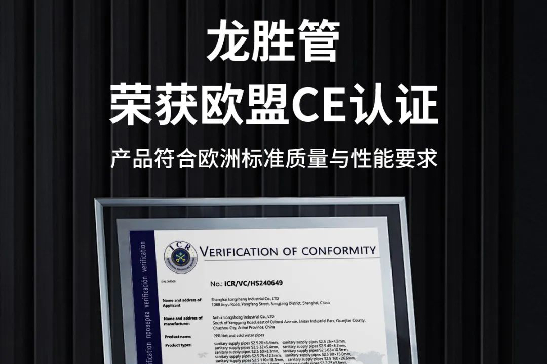 經過嚴格的全方位檢測和多項技術評估,龍勝管PPR水管產品順利通過歐盟CE認證,成功獲得這一打開并進入歐洲市場的...